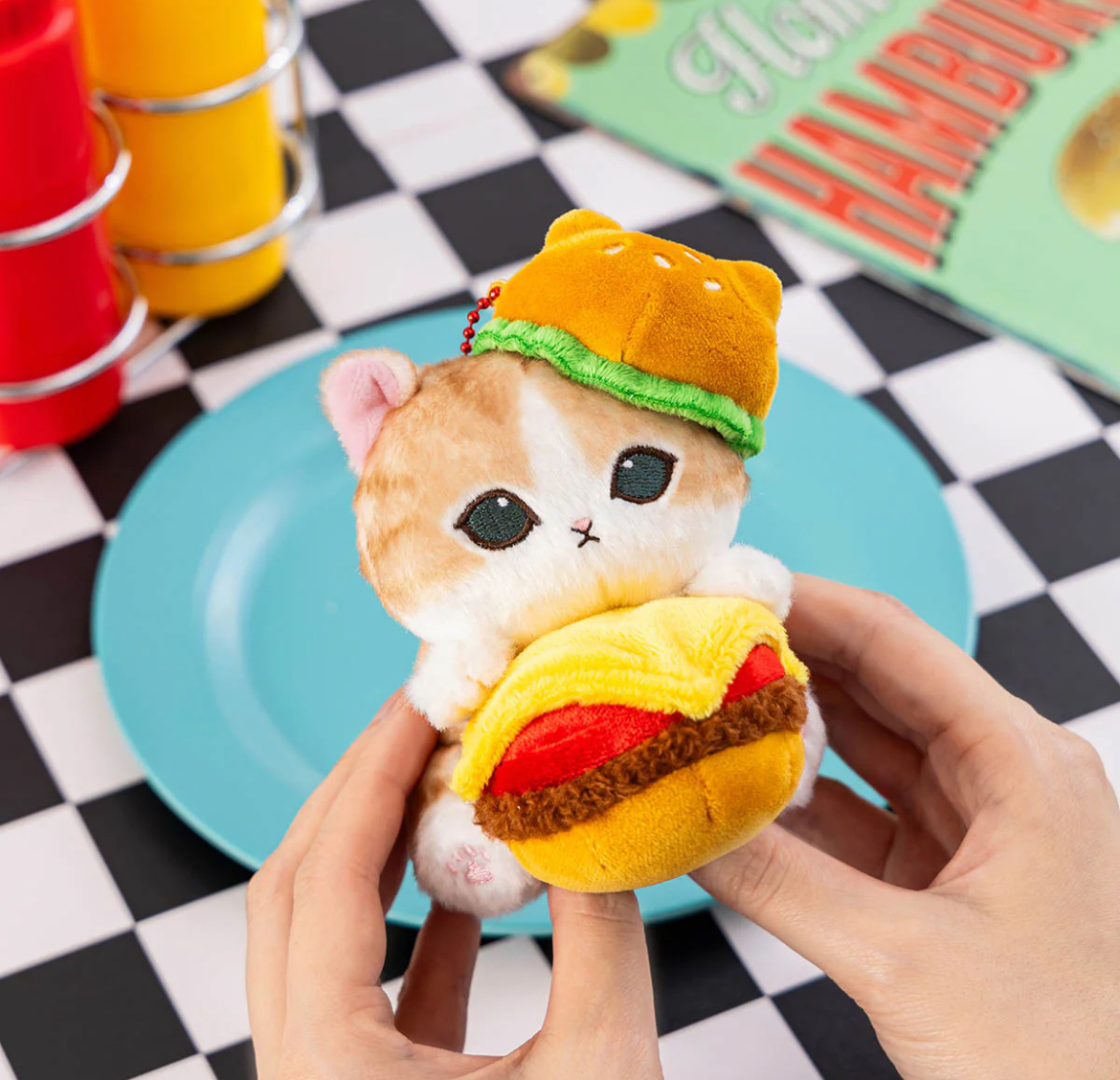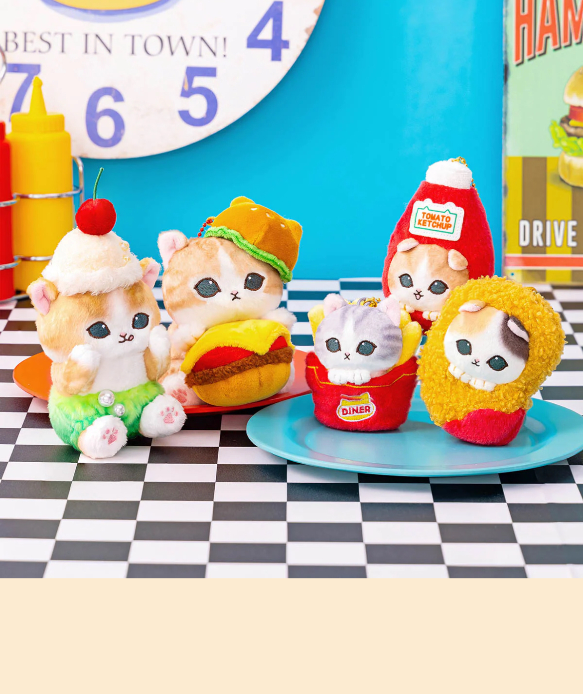 預訂14個工作天到貨 1. Nyan Burger 漢堡喵 一隻小貓從圓形麵包裡鑽出來!這款 漢堡造型可愛,裡面塞滿了芝士、生菜和番茄。 和你的小貓一起享受漢堡時光吧♪ 尺寸(約):H120 x W90 x D120mm 2. 雪糕梳打喵 復古又可愛的貓咪♪ 甜甜的雪榚上放著一顆櫻桃。他一臉貪婪地舔了起來! 尺寸(約):H150 x W80 x D80mm 3. 型格皮褸喵 清涼又慵懶的嘴巴! 身穿黑色皮衣、戴著墨鏡的酷酷時尚貓咪♪ 黑色標籤更添獨特韻味★ 尺寸(約):H140 x W105 x D75mm